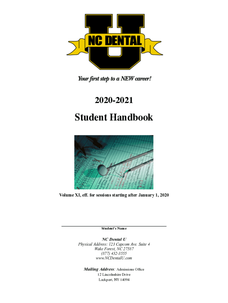 2020202Student HandbooVolume XI, eff. For sessions starting after January 1, 2020___ Students Name NC Dental Physical Address: 123 Cap com Ave. Suite 4 Wake Forest, NC 27587 (877) 4323555 www.NCDentalU.comMailing