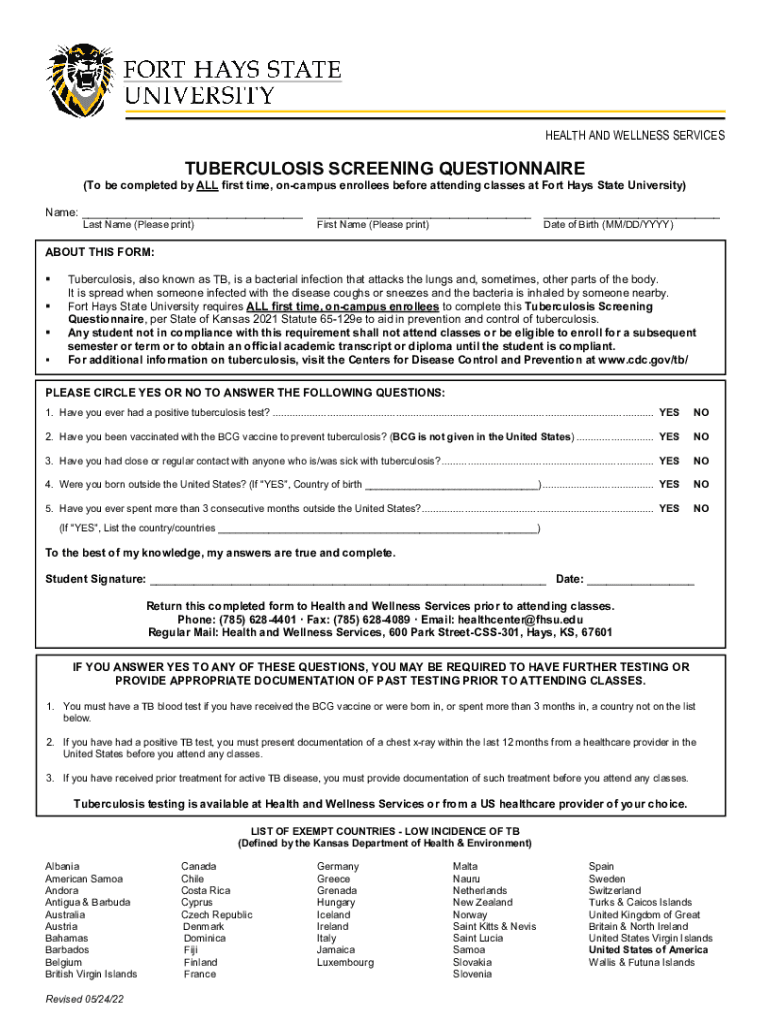 HEALTH AND WELLNESS SERVICESTUBERCULOSIS SCREENING QUESTIONNAIRE(To be completed by ALL first time, on campus enrolled before attending classes at Fort Hays State University) Name: ___ Last Name (Please