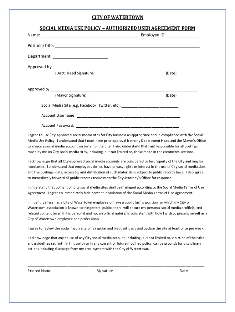 CITY OF WATERTOWNSOCIAL MEDIA USE POLICY AUTHORIZED USER AGREEMENT Forename:___Employee ID:___ Position/Title:___ Department:___ Approved by___ (Dept. E-signature)(Date)Approved by___ (MayorSignature)