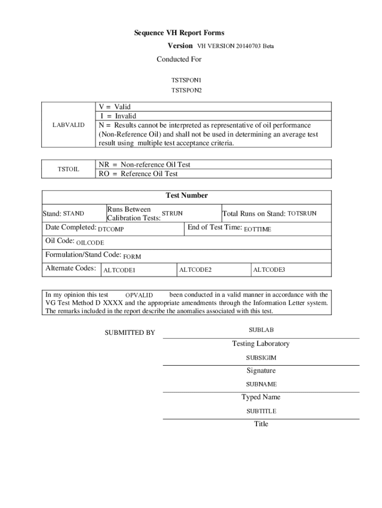 Sequence VH Report Forms Version VH VERSION 20140703 Beta Conducted For TSTSPON1 TSTSPON2LABVALIDTSTOILV Valid I Invalid N Results cannot be interpreted as representative of oil performance (Conference