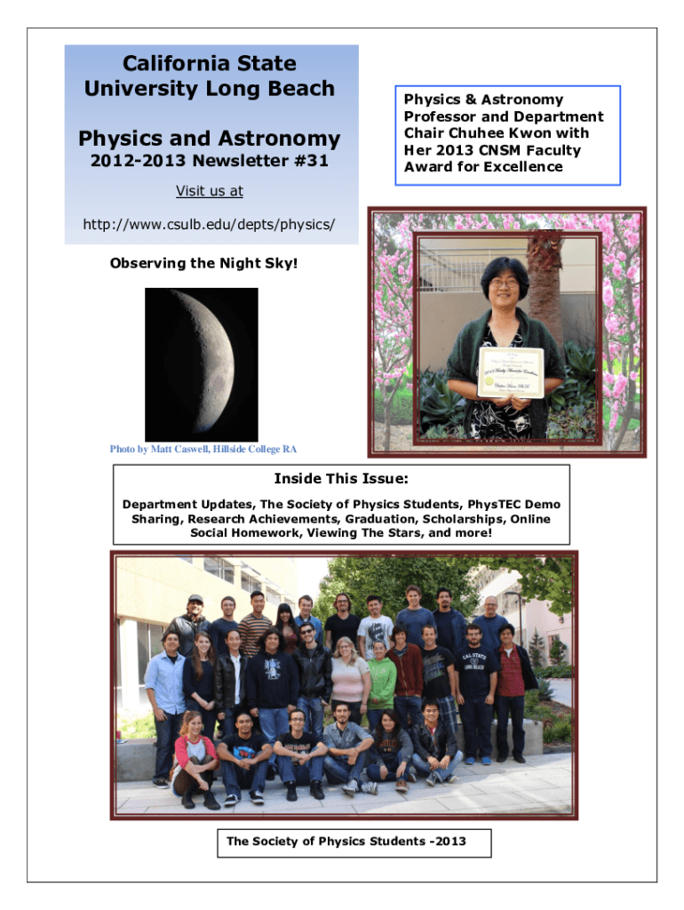 California State University Long Beach Physics and Astronomy 20122013 Newsletter #31Physics & Astronomy Professor and Department Chair Chute Won with Her 2013 CNS Faculty Award for ExcellenceVisit