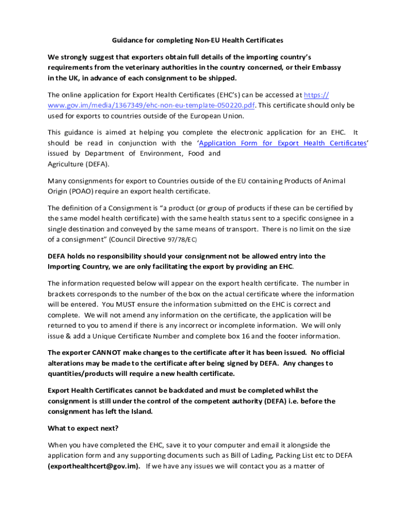 Guidance for completing None Health Certificates We strongly suggest that exporters obtain full details of the importing countries requirements from the veterinary authorities in the country concerned,