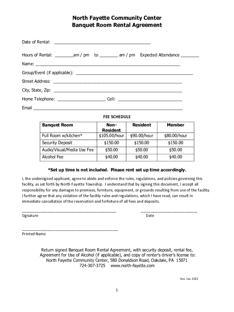 North Fayette Community Center Banquet Room Rental Agreement Date of Rental: ___ Hours of Rental: ___am / PTO ___ am / expected Attendance ___Name: ___ Group/Event (if applicable): ___ Street Address: