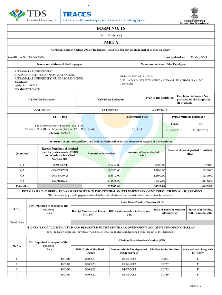 Get the free "FORM NO.16 See rule 31(1)(a) PART A Certificate ... - Webtel