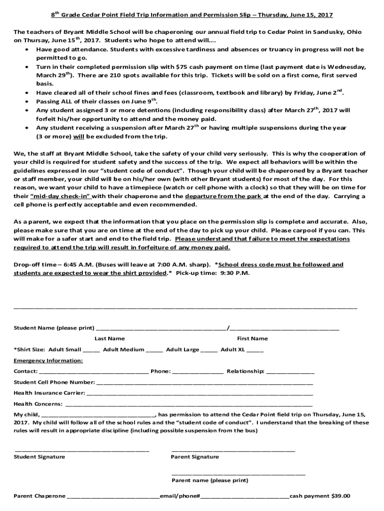 8th Grade Cedar Point Field Trip Information and Permission Slip Thursday, June 15, 2017, The teachers of Bryant Middle School will be chaperoning our annual field trip to Cedar Point in Sandusky,