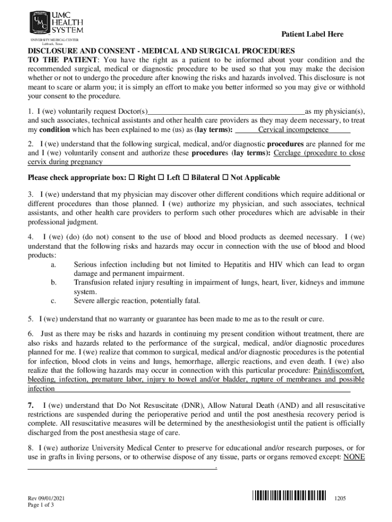 Patient Label Here UNIVERSITY MEDICAL CENTER Lubbock, TexasDISCLOSURE AND CONSENT MEDICAL AND SURGICAL PROCEDURES TO THE PATIENT: You have the right as a patient to be informed about your condition