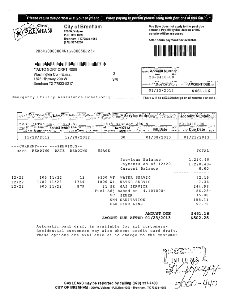 Please return this portion with your payment. When paying In person please bring both portions of this bill. City of BrenhamDue Date does not apply to the past due