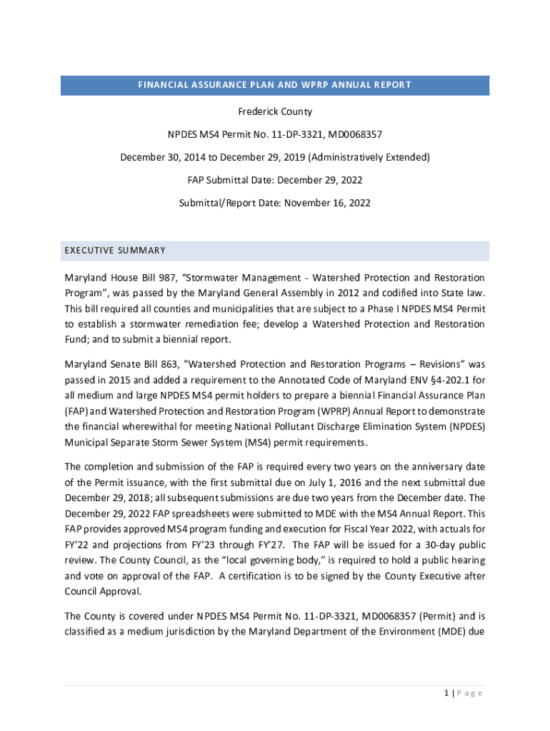 FINANCIAL ASSURANCE PLAN AND WARP ANNUAL REPORT Frederick County NODES MS4 Permit No. 11DP3321, MD0068357 December 30, 2014, to December 29, 2019 (Administratively Extended) FAP Submittal Date: December