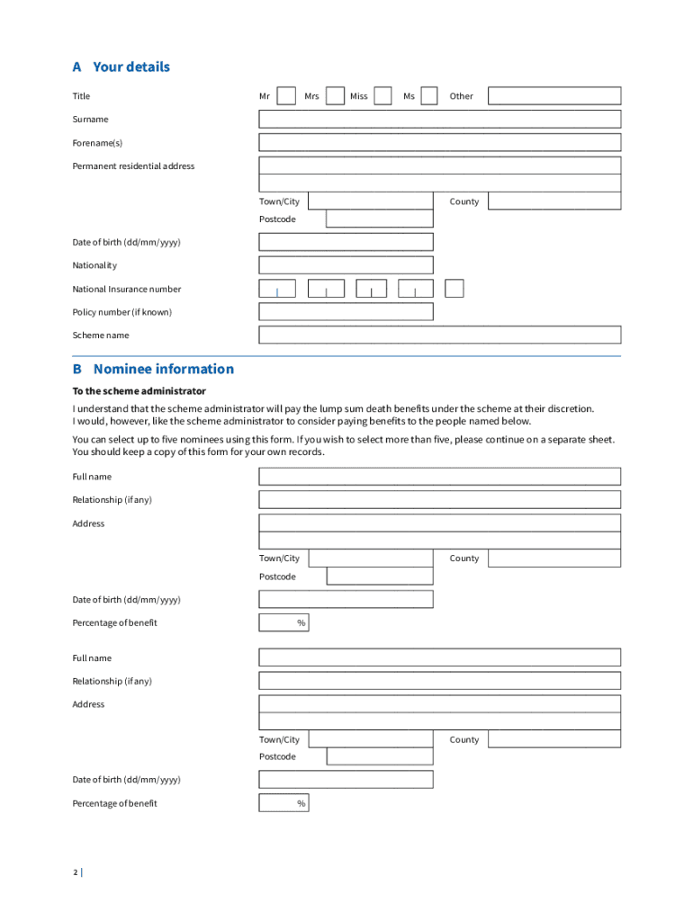 Nomination forms for pensioners are documents that allow pensioners to designate who will receive their pension benefits in the event of their death.