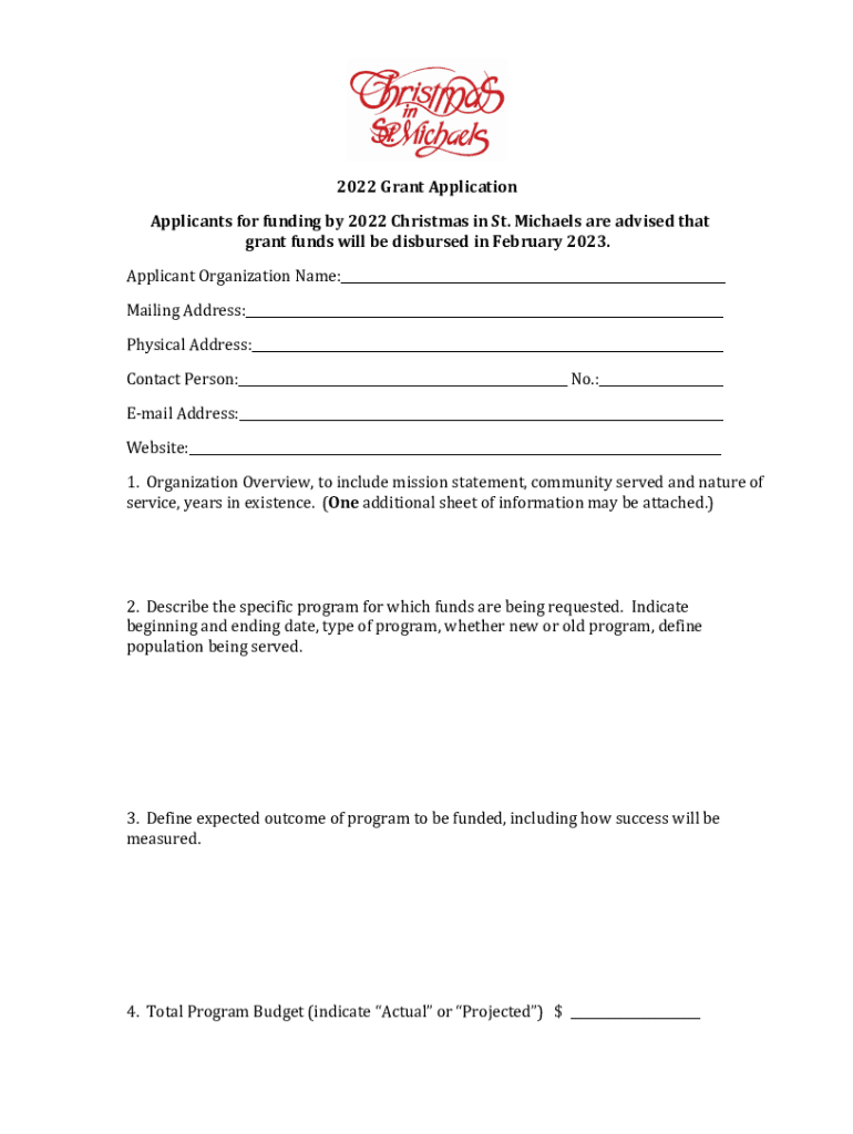 2022 Grant ApplicationApplicants for funding by 2022 Christmas in St. Michael's are advised that grant funds will be disbursed in February 2023. Applicant Organization Name:___Mailing Address:___Physical