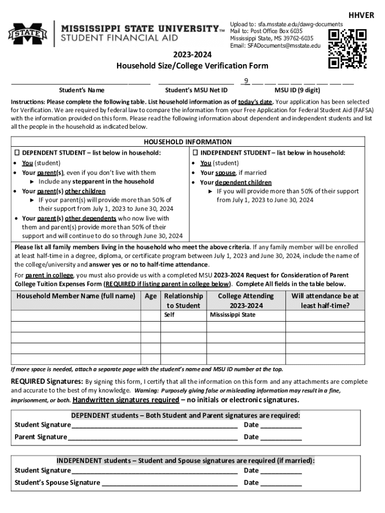 HOVER Upload to: sfa.msstate.edu/dawgdocuments Mail to: Post Office Box 6035 Mississippi State, MS 397626035 Email: SFADocuments@msstate.edu20232024 Household Size/College Verification Form ______