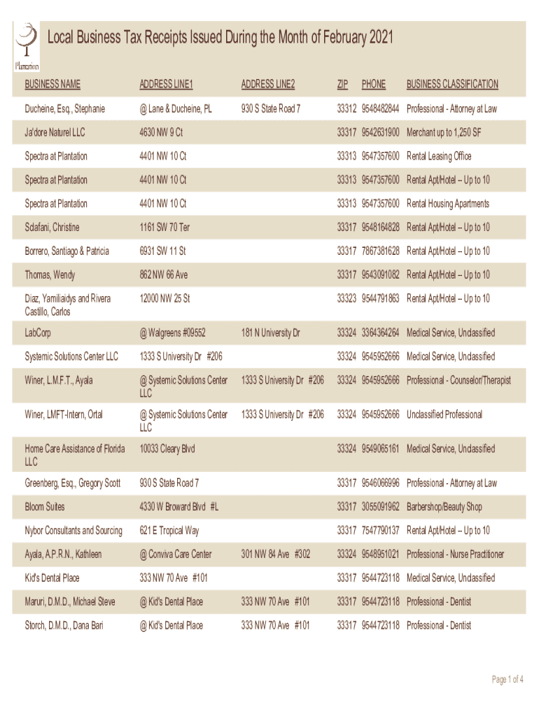 Local Business Tax Receipts Issued During the Month of February 2021 BUSINESS HEADDRESS LINE1ADDRESS LINE2ZIPDucheine, Esq., Stephanie Lane & Duchamp, PL930 S State Road 733312 9548482844Professional