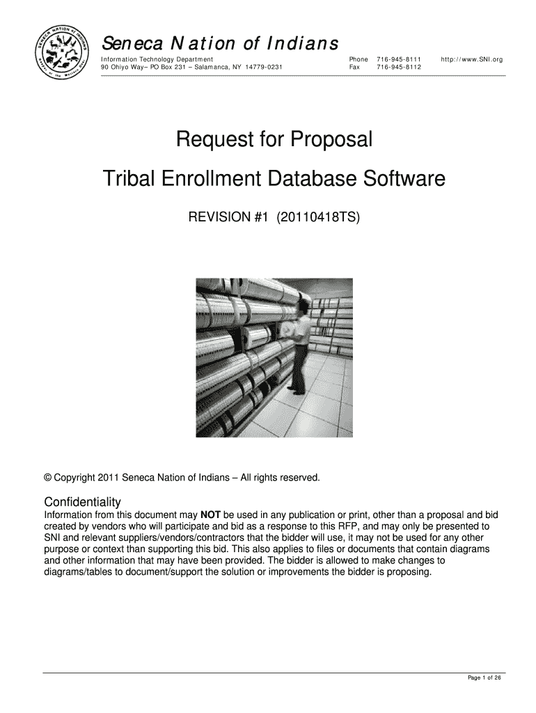 Seneca Nation of Indians Information Technology Department 90 Ohio Way PO Box 231 Salamanca, NY 14779-0231 Phone Fax 716-945-8111 716-945-8112 http://www.SNI.org Request for Proposal Tribal Enrollment