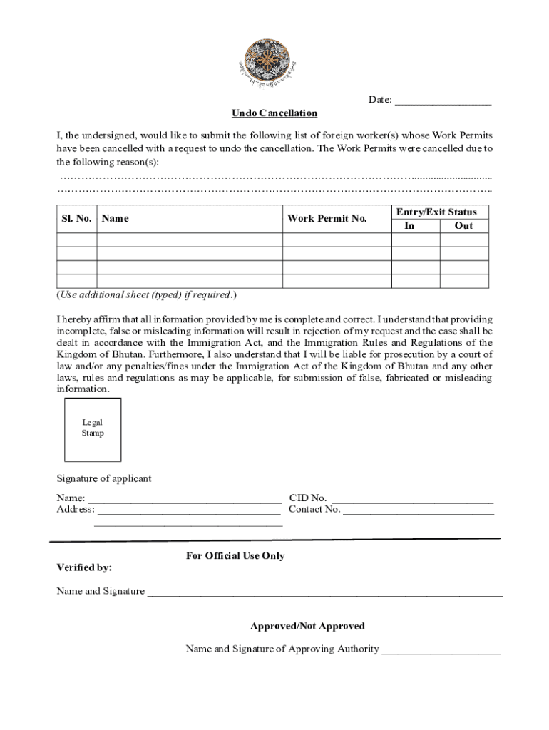 Date: ___ Undo Cancellation I, the undersigned, would like to submit the following list of foreign worker(s) whose Work Permits have been cancelled with a request to undo the cancellation. The Work