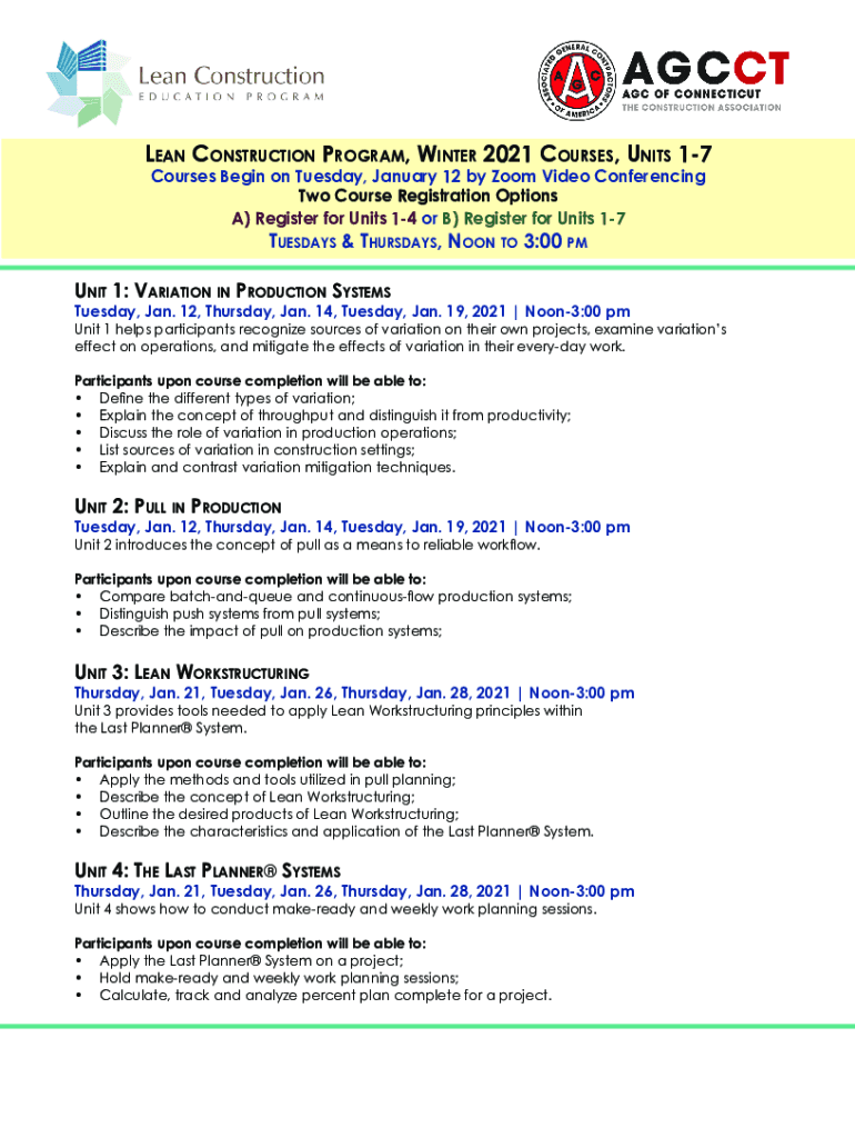 Lean Construction Program, Winter 2021 Courses, Units 17 Courses Begin on Tuesday, January 12 by Zoom Video Conferencing Two Course Registration Options A) Register for Units 14 or B) Register for
