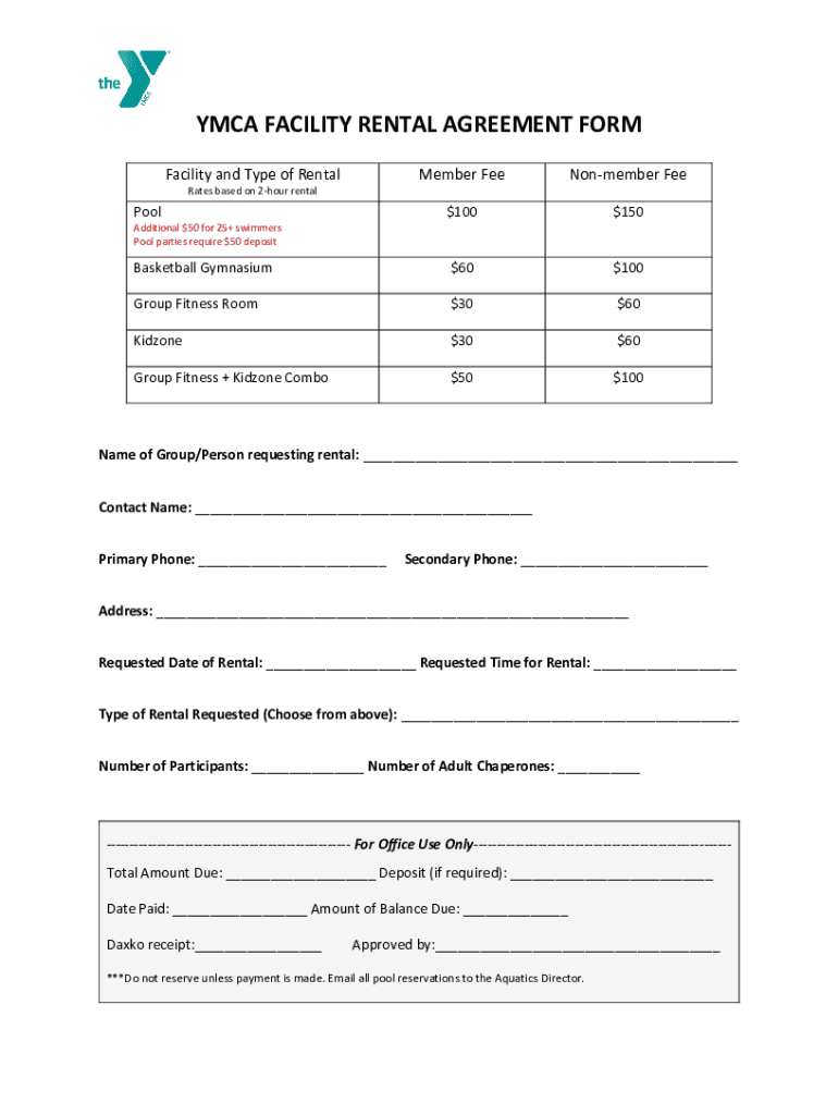Any individual or organization looking to rent out space within a YMCA facility is required to file a rental agreement.