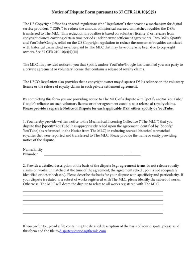 Notice of Dispute Form pursuant to 37 CFR 210.10(c)(5) The US Copyright Office has enacted regulations (the Regulation) that provide a mechanism for digital service providers (DSP) to reduce the amount