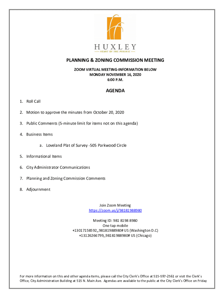 PLANNING & ZONING COMMISSION MEETING ZOOM VIRTUAL MEETINGINFORMATION BELOW MONDAY, NOVEMBER 16, 2020 6:00 P.M.AGENDA 1. Roll Call 2. Motion to approve the minutes from October 20, 2020 3. Public Comments