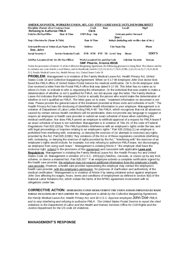 Step 1 Grievance Outline Worksheet - APWU Local 458 template instructions