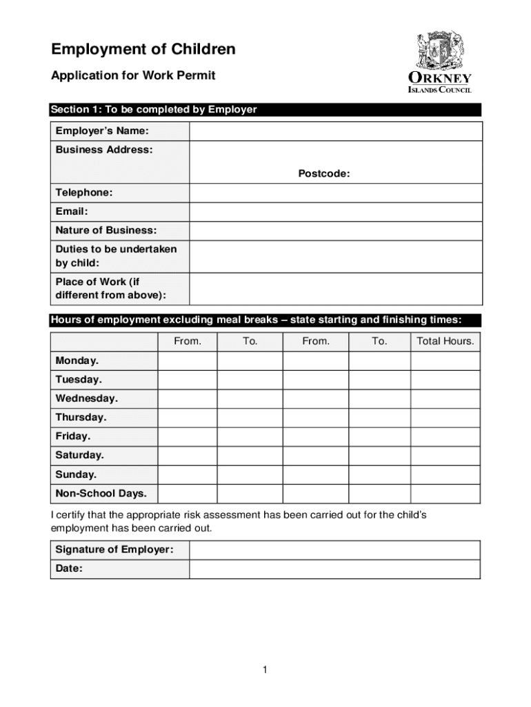 Employment of Children Application for Work Permit Section 1: To be completed by Employer Employers Name: Business Address: Postcode: Telephone: Email: Nature of Business: Duties to be undertaken
