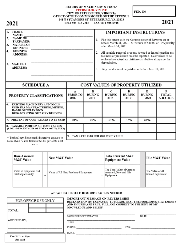 RETURN OF MACHINERY & TOOLS TECHNOLOGY ZONE CITY OF PETERSBURG, VIRGINIA OFFICE OF THE COMMISSIONER OF THE REVENUE 144 N SYCAMORE ST PETERSBURG, VA 23803 TEL: 8047332315 FAX: 80450869482021 1. 2.