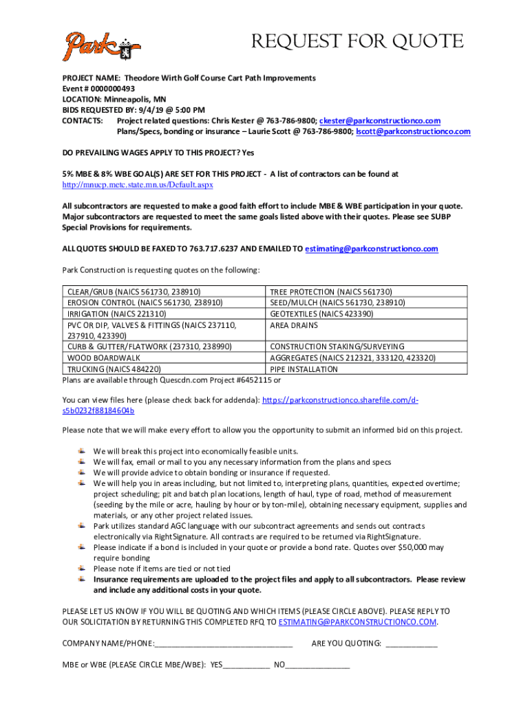 REQUEST FOR QUOTE PROJECT NAME: Theodore With Golf Course Cart Path Improvements Event # 0000000493 LOCATION: Minneapolis, MN BIDS REQUESTED BY: 9/4/19 @ 5:00 PM CONTACTS: Project related questions: