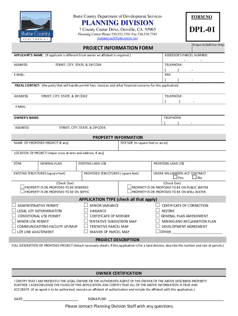 Butte County Department of Development ServicesFORM PLANNING DIVISIONDPL017 County Center Drive, Orville, CA 95965 Planning Center Phone 530.552.3701 Fax 530.538.7785 dsplanning@buttecounty.netProject