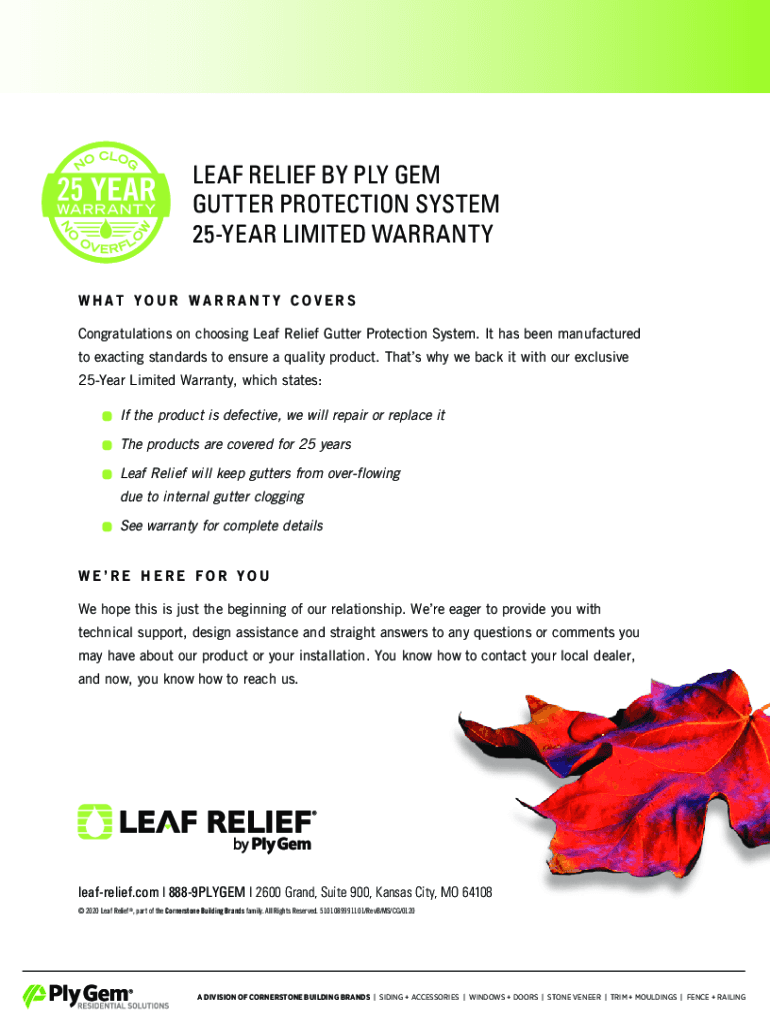 LEAF RELIEF BY PLY GEM GUTTER PROTECTION SYSTEM 25YEAR LIMITED WARRANTY WHAT YOUR WARRANTY COVERS Congratulations on choosing Leaf Relief Gutter Protection System. It has been manufactured to exacting