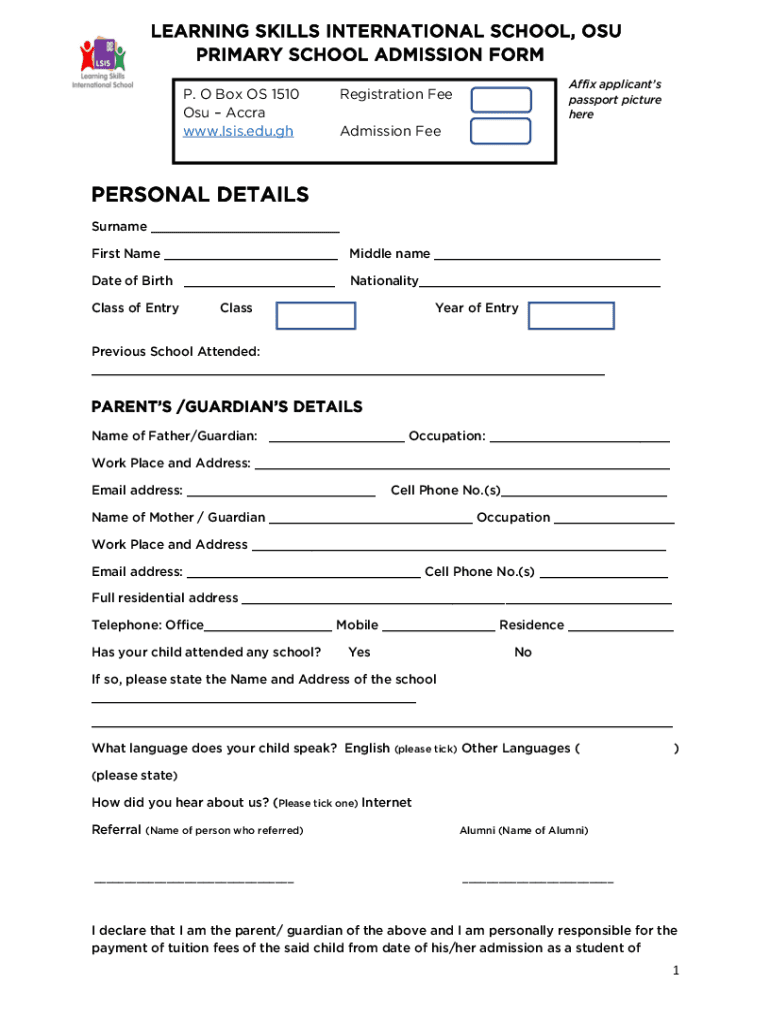 LEARNING SKILLS INTERNATIONAL SCHOOL, OSU PRIMARY SCHOOL ADMISSION FORM P. O Box OS 1510 OSU Accra www.Isis.edu.ghAffix applicants passport picture preregistration Fee Admission Personal DETAILS Surname