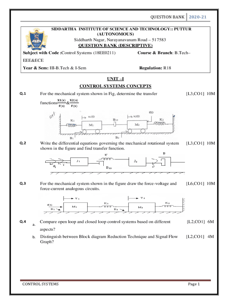 QUESTION BANK 202021 SIDDHARTHA INSTITUTE OF SCIENCE AND TECHNOLOGY:: PUTTER(AUTONOMOUS) Siddharth Nagar, Narayanavanam Road 517583 QUESTION BANK (DESCRIPTIVE) Subject with Code :Control Systems (18EE0211)Course