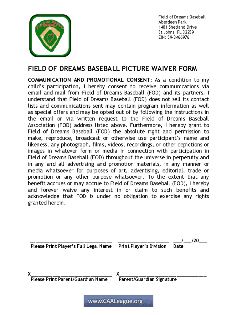 Field of Dreams Baseball Aberdeen Park 1401 Shetland Drive St Johns, FL 32259 EIN: 593466976FIELD OF DREAMS BASEBALL PICTURE WAIVER FORM COMMUNICATION AND PROMOTIONAL CONSENT: As a condition to my