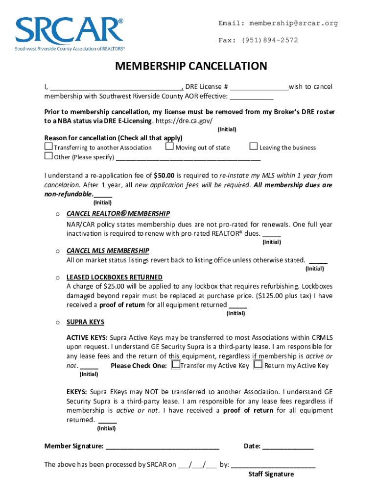 Email: membership@srcar.org Fax: (951)8942572MEMBERSHIP CANCELLATION I, ARE License # ___wish to cancel membership with Southwest Riverside County AOR effective: ___ Prior to membership cancellation,
