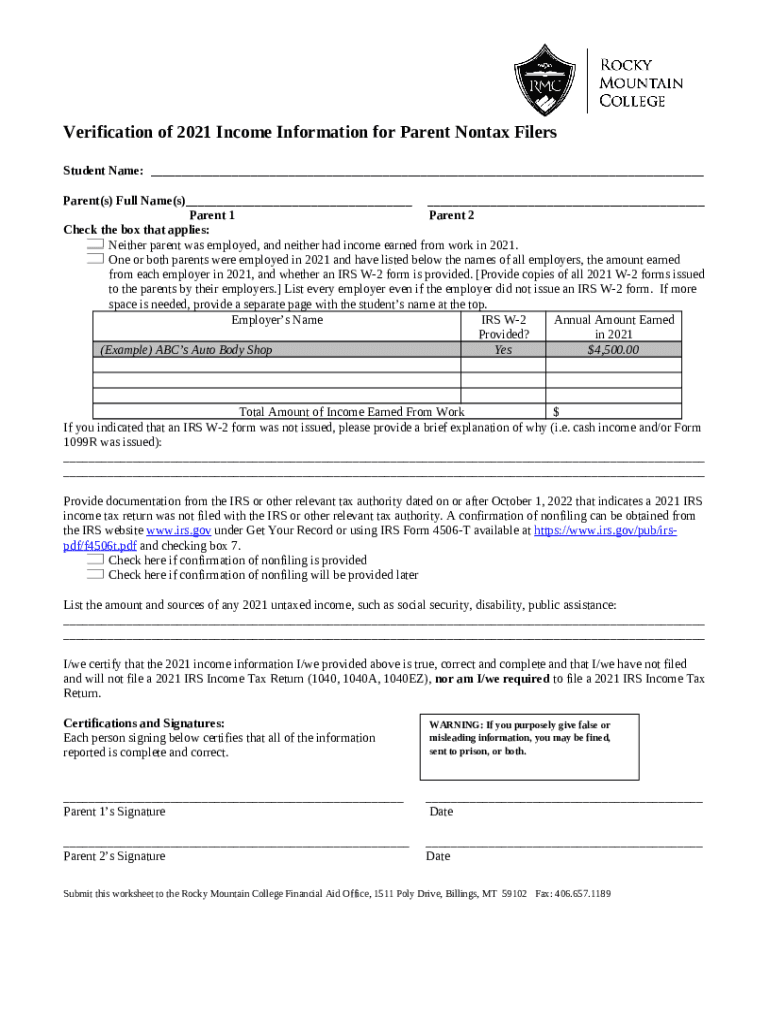 Instructions for the Verification of 2021 Income Ination for Parent Nontax Filers form
