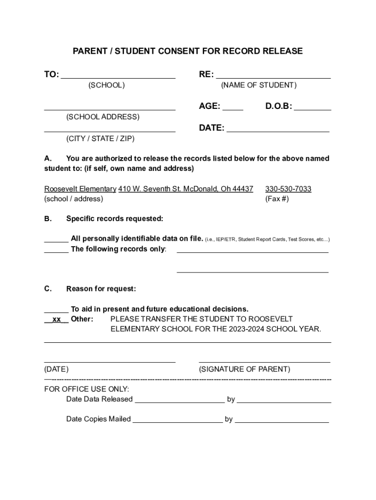 PARENT / STUDENT CONSENT FOR RECORD RELEASE TO: ___ (SCHOOL) ___ (SCHOOL ADDRESS) ___ (CITY / STATE / ZIP’RE: ___ (NAME OF STUDENT)AGE: ___D. O. B: ___DATE: ___A. You are authorized to release the