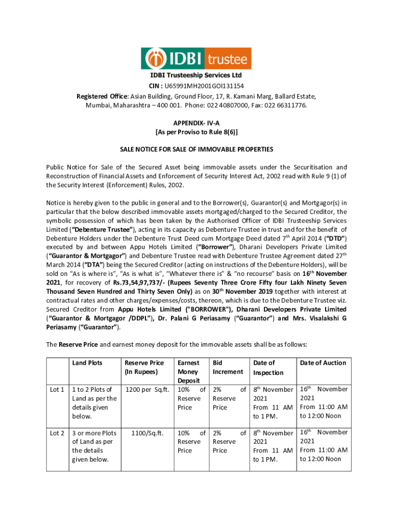 IN : U65991MH2001GOI131154 Registered Office: Asian Building, First Floor, 17, R. Kazan Mary, Ballard Estate, Mumbai, Maharashtra 400 001. Phone: 022 40807000, Fax: 022 66311776. APPENDIX IVA [As