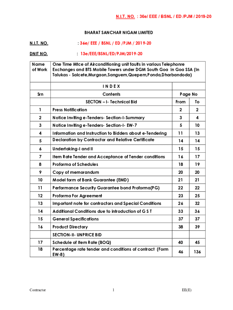 N.I.T. NO. 36e/ EEE / BSNL / ED /PM / 201920 BHARAT ANCHOR NI GAM LIMITED N.I.T. NO.: 36e/ EEE / BSNL / ED /PM / 201920DNIT NO.: 13e/EEE/BSNL/ED/PM/201920Name of Working Time Mice of Air conditioning