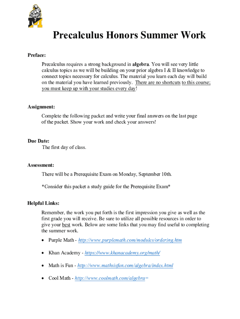 Precalculus Honors Summer Work Preface: Precalculus requires a strong background in algebra. You will see very little calculus topics as we will be building on your prior algebra I & II knowledge