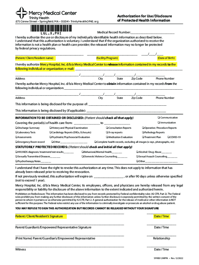271 Care Street Springfield, MA 01104 TrinityHealthOfNE.preauthorization for Use/Disclosure of Protected Health InformationMedical Record Number:___ I hereby authorize the use or disclosure of my