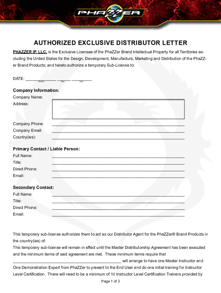 AUTHORIZED EXCLUSIVE DISTRIBUTOR LETTER