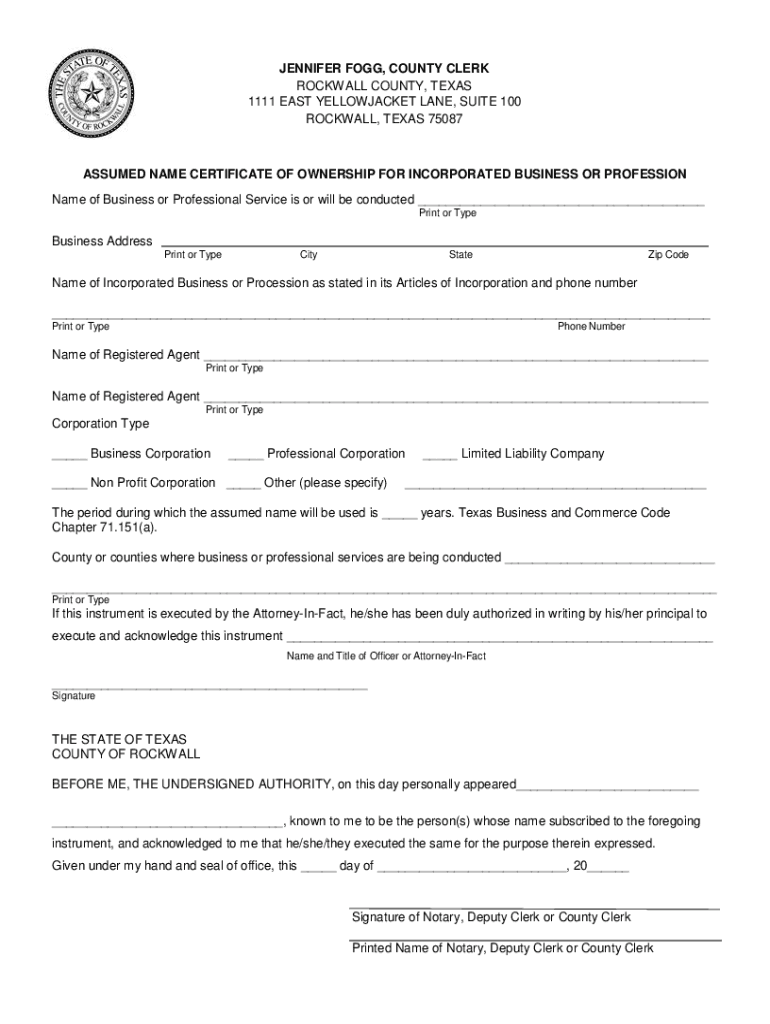 ROCKWELL, TEXAS 75087ASSUMED NAME CERTIFICATE OF OWNERSHIP FOR INCORPORATED BUSINESS OR PROFESSION