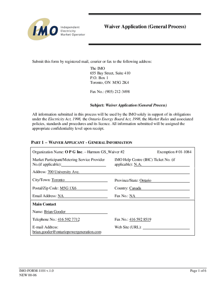 Waiver Application (General Process)Submit this form by registered mail, courier or fax to the following address: The IMO 655 Bay Street, Suite 410 P.O. Box 1 Toronto, ON M5G 2K4 Fax No.: (905) 2123498