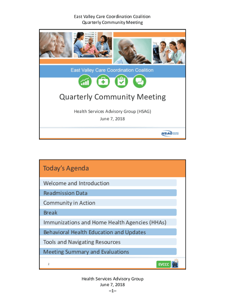 East Valley Care Coordination Coalition Quarterly Community MeetingQuarterly Community Meeting Health Services Advisory Group (HAG) June 7, 2018Todays Agenda Welcome and Introduction Readmission Data