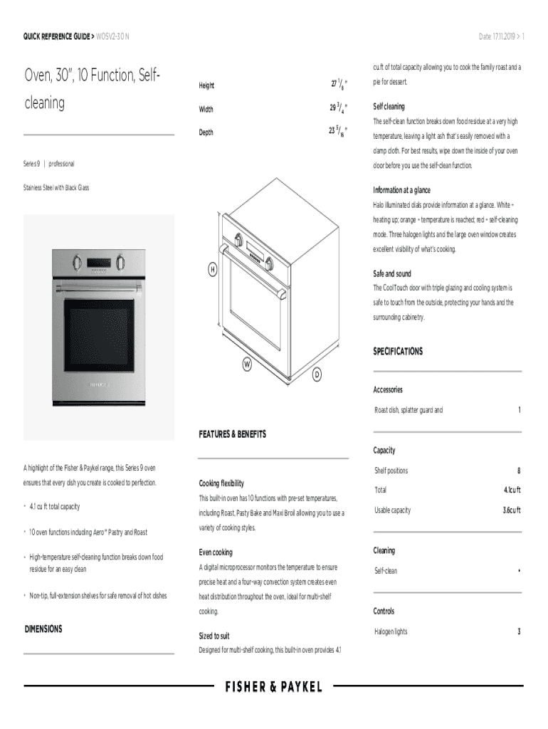 QUICK REFERENCE GUIDE WOSV230 Novel, 30\”, 10 Function, SelfcleaningDate: 17.11.2019 1 cu. Ft of total capacity allowing you to cook the family roast and a Height27 1/8 \” pie for dessert. Width29