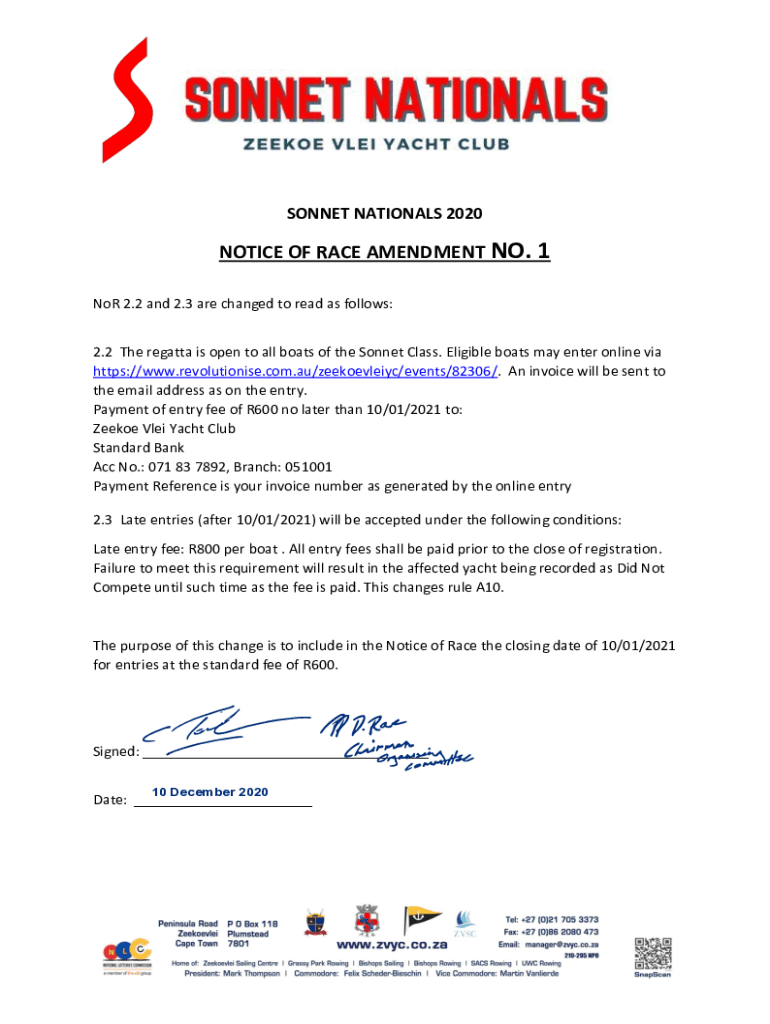 SONNET NATIONALS 2020NOTICE OF RACE AMENDMENT NO. 1 Nor 2.2 and 2.3 are changed to read as follows: 2.2 The regatta is open to all boats of the Sonnet Class. Eligible boats may enter online via https://www.revolutionise.com.au/zeekoevleiyc/events/82306/.