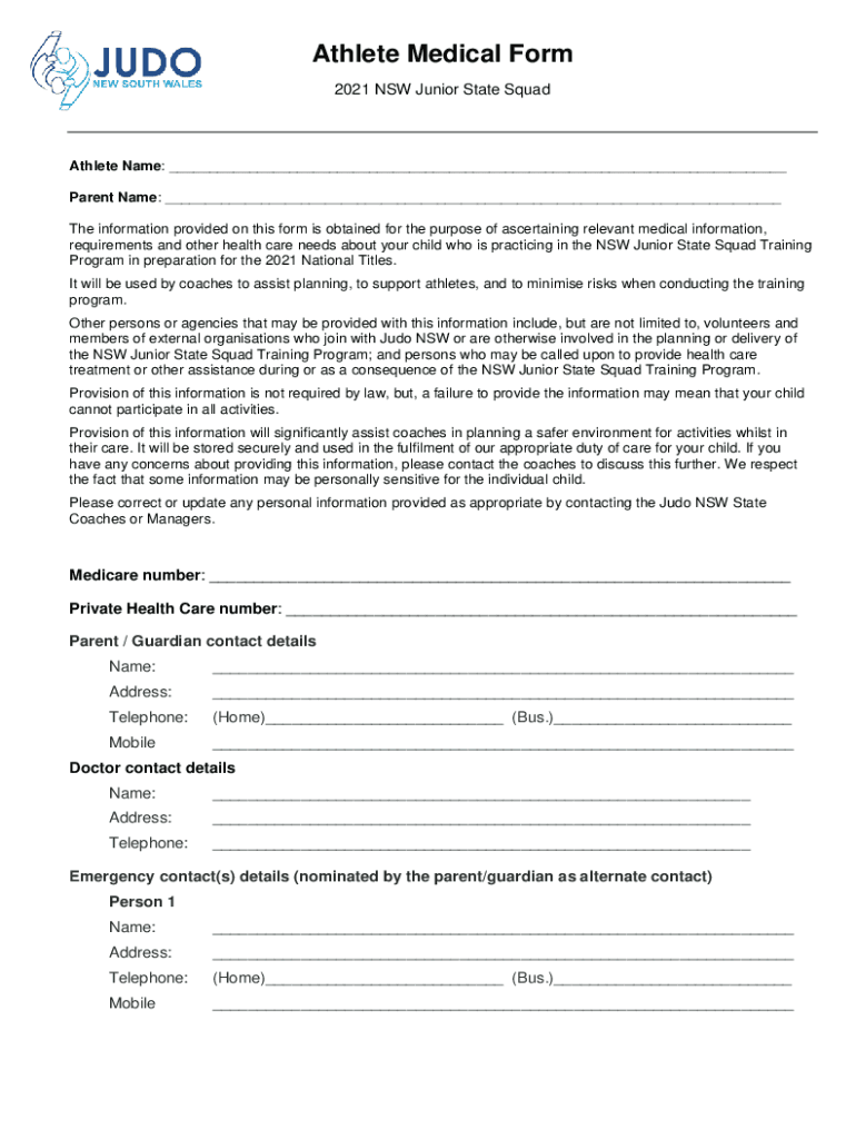 Athlete Medical Form 2021 NSW Junior State SquadAthlete Name: ___ Parent Name: ___ The information provided on this form is obtained for the purpose of ascertaining relevant medical information, requirements