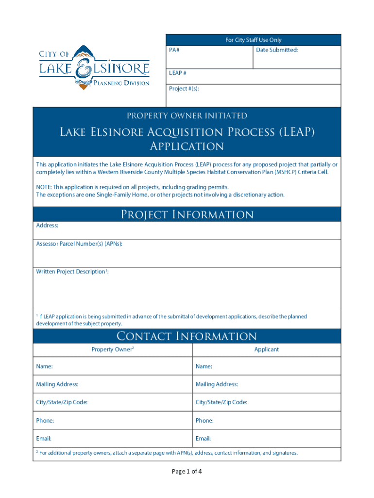 For City Staff Use Only PA#Date Submitted:LEAP # Project #(s):PROPERTY OWNER INITIATEDLake Elsinore Acquisition Process (LEAP) Application This application initiates the Lake Elsinore Acquisition