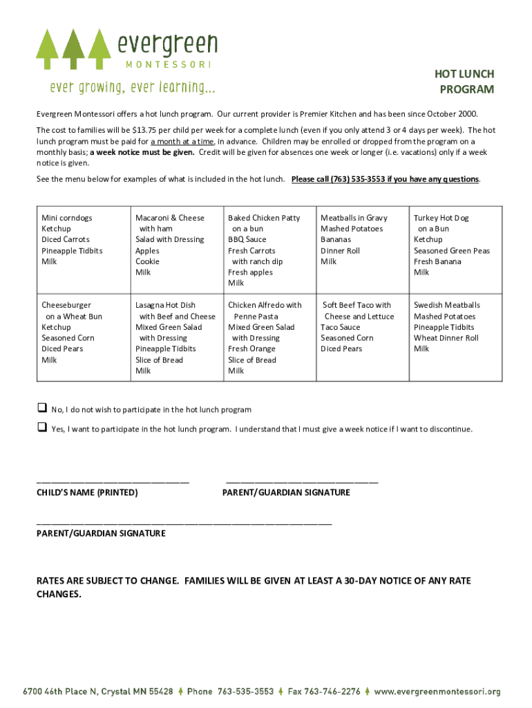 HOT LUNCH PROGRAM Evergreen Montessori offers a hot lunch program. Our current provider is Premier Kitchen and has been since October 2000. The cost to families will be $13.75 per child per week for