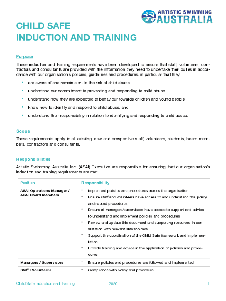 CHILD SAFE INDUCTION AND TRAINING Purpose These induction and training requirements have been developed to ensure that STA, volunteers, contractors and consultants are provided with the information
