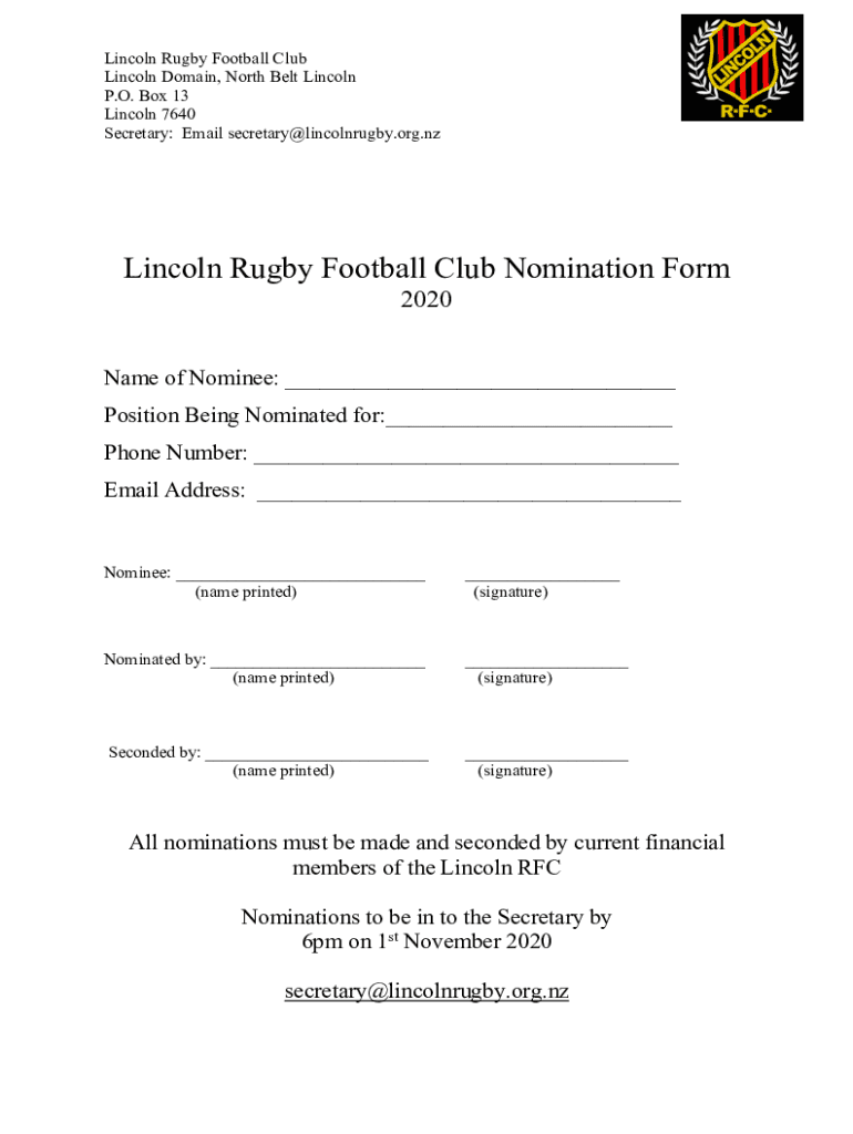 Lincoln Rugby Football Club Lincoln Domain, North Belt Lincoln P.O. Box 13 Lincoln 7640 Secretary: Email secretary@lincolnrugby.org.nzLincoln Rugby Football Club Nomination Form 2020 Name of Nominee:
