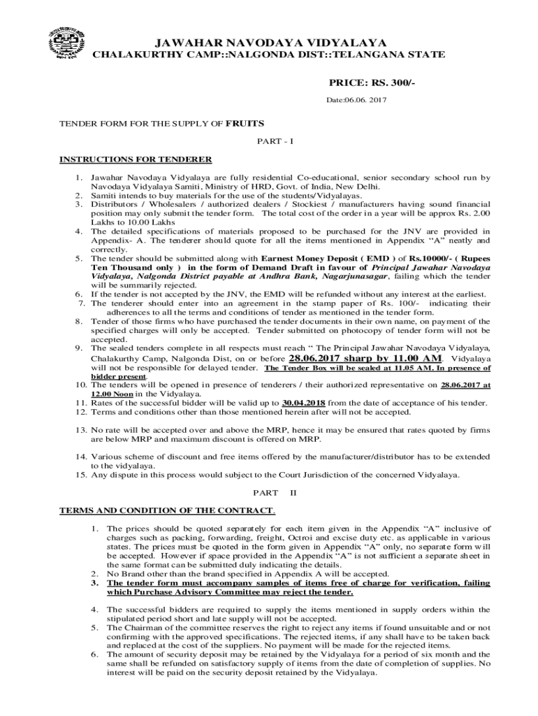 PRICE: RS. 300/Date:06.06. 2017TENDER FORM FOR THE SUPPLY OF FRUITS
